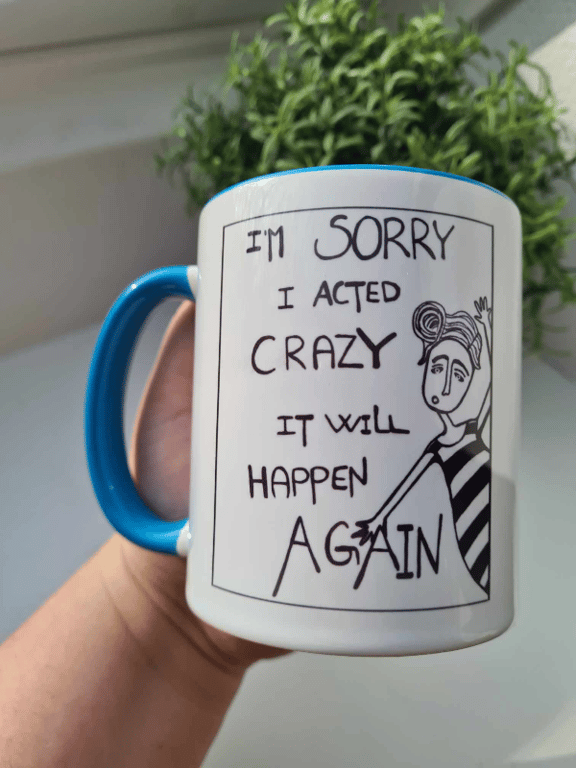 Kop med teksten "im sorry i acted crazy it will happen again"