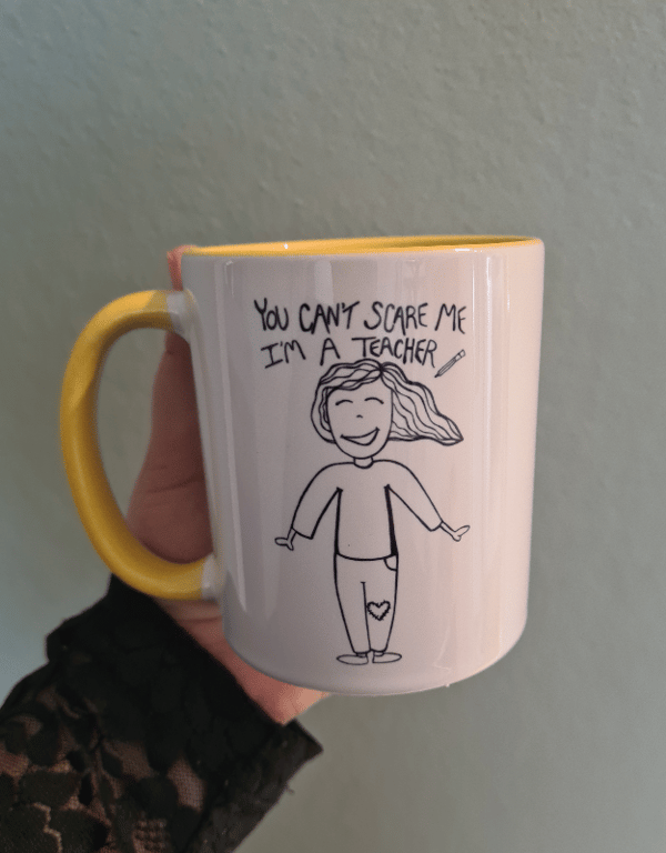 Krus med håndtegnet trykt motiv.