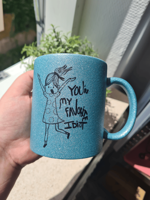 Krus med håndtegnet trykt motiv.